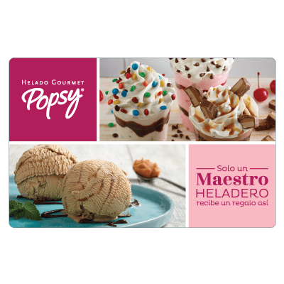 "Sorprende a tus seres queridos regalándoles una tarjeta regalo para que escojan y disfruten de el más rico helado. Imágenes de referencia Es un medio de pago valido en cualquier Heladería Popsy del país, aplica para cualquier producto de la heladería."