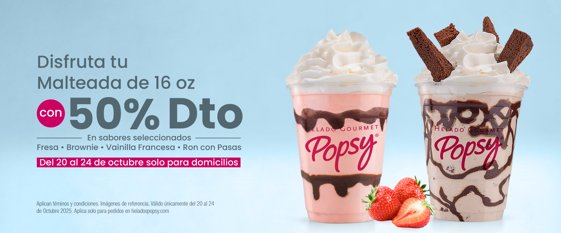50% de descuento en malteada de 16 onzas en los sabores de: Fresa, Brownie, Vainilla Francesa y Ron con pasas Imagen de ambientación. 50% de descuento en malteada de 16 onzas en sabores seleccionados. Fresa, Brownie, Vainilla Francesa y Ron con pasas, (no aplica para otros sabores). La promoción estará disponible desde el 20 hasta el 24 de octubre de 2025. La oferta aplica únicamente para pedidos realizados a domicilio a través de nuestra página web oficial: www.heladospopsy.com. La disponibilidad de la promoción, la cobertura de los domicilios y el inventario de los sabores participantes está sujeta al punto de venta que atienda el pedido. El valor del servicio a domicilio se cobra por separado y no está incluido en el descuento del 50%. El tiempo de entrega es estimado y está sujeto al volumen de pedidos. La promoción no es acumulable con otras ofertas o descuentos vigentes. No aplica para pedidos realizados a través de otros agregadores de domicilios (apps de terceros) ni en pedidos realizados en franquicias Popsy® (puntos de venta operados por franquiciados). La adición de Toppings o salsas extra que no sean parte de la receta original de la malteada generará un recargo adicional, el cual será cobrado según la lista de precios vigente. En caso de dudas, por favor escríbenos al correo: sugerencias@heladospopsy.com