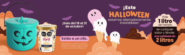 La decoración es de ambientación. Disponible del 18 al 31 de octubre de 2025. Por la compra de un (1) litro de helado Popsy® de cualquier sabor, recibe una (1) calabaza plástica color turquesa con capacidad de dos (2) litros como obsequio. La calabaza se entrega vacía y no incluye helado. Aplica únicamente para Domicilios Popsy® (www.domiciliospopsy.com) y agregadores (Rappi y DIDI), en los puntos de venta participantes que ofrezcan el producto en su menú, según la cobertura expuesta en cada portal. No aplica en franquicias, ni en compras presenciales. Tiempo de entrega estimado según el orden de pedidos. El valor del domicilio se cobra por separado. Productos sujetos a disponibilidad de inventarios en heladería. No acumulable con otras promociones. Los Toppings y salsas generan recargo según la lista de precios.