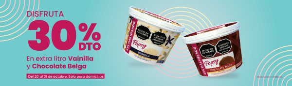 30% de descuento en tu segundo extralitro sabores Vainilla y/o Chocolate Belga Imagen de ambientación. Obtén un 30% de descuento en la compra de tu segundo extralitro. Solo aplica para los sabores de Vainilla y/o Chocolate Belga. La promoción está disponible desde el 18 hasta el 31 de octubre de 2025. Esta oferta es únicamente para pedidos a domicilio realizados a través de: Nuestra página web oficial: www.heladospopsy.com, Los agregadores: RAPPI y DIDI. La disponibilidad de la promoción depende de la zona de cobertura de los domicilios y el inventario del punto de venta. El valor del domicilio se cobra por separado y no está incluido en el descuento. El tiempo de entrega es estimado y está sujeto al volumen de pedidos. La promoción no es acumulable con otras ofertas o descuentos vigentes. No aplica en pedidos realizados en franquicias Popsy®. La adición de Toppings o salsas extra que no sean parte de la receta original generará un recargo adicional según la lista de precios. En caso de dudas, por favor escríbenos al correo: sugerencias@heladospopsy.com